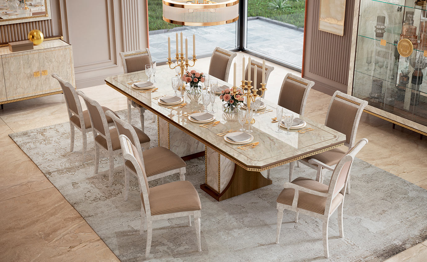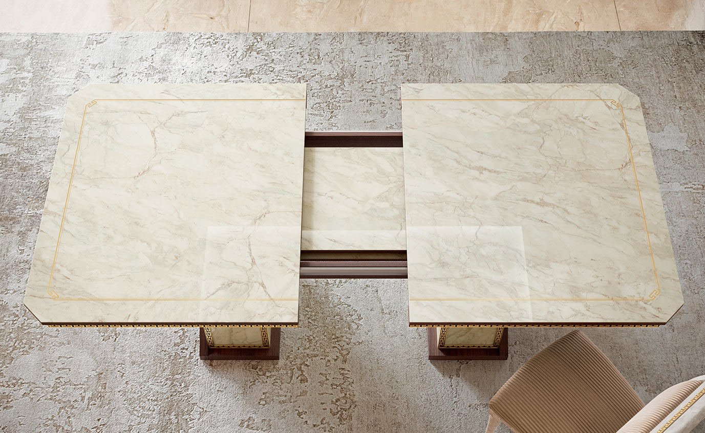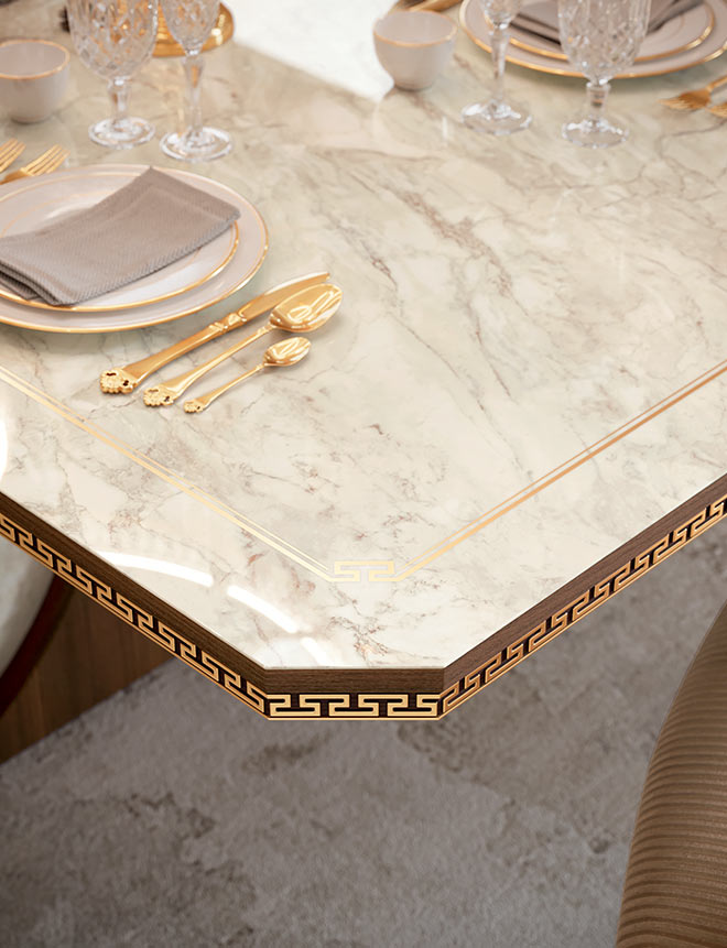 The Romantica dining room proposes a wide collection of furniture for the dining area, combining the charm of classic with the freshness of contemporary. The common thread that unites them is the walnut wood effect side that embraces the internal structure in glossy Carrara marble finish, giving life to a refined chromatic contrast. The neoclassical fret in gold finish and the 24-carat gold-plated handles illuminate and embellish.