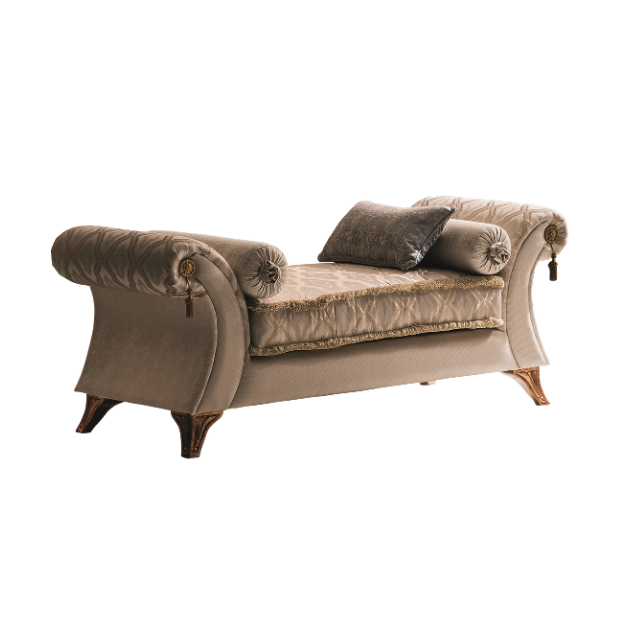 “Vittoria” è una chaise longue di grande presenza estetica e di incredibile potenziale decorativo, nonché un elemento di arredo di grande comfort ideale per allestire camera da letto e zona living. Nell’insieme la seduta presenta un disegno snello e continuo che segue la linea dei braccioli sbocciando verso l’esterno e creando una dolce curva che sembra invitare a sedersi per assaporare piacevoli momenti di relax.