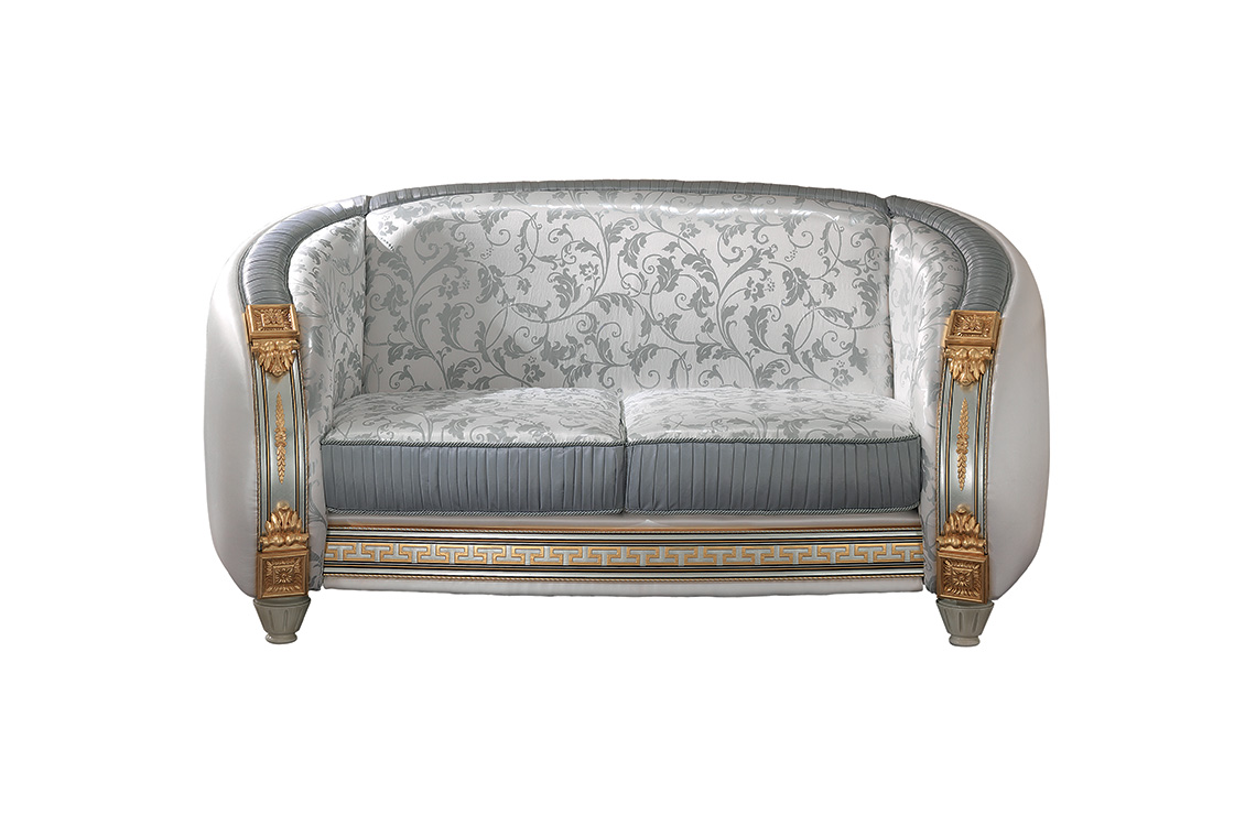 I divani Liberty, con le loro linee morbide e arrotondate, aggiungono un pizzico di vanità alla collezione. Confortevoli, grazie alle ampie e avvolgenti sedute, non rinunciano mai a un dettaglio brillante che, assieme alla greca dorata della cornice basamentale, impreziosisce i braccioli laterali.