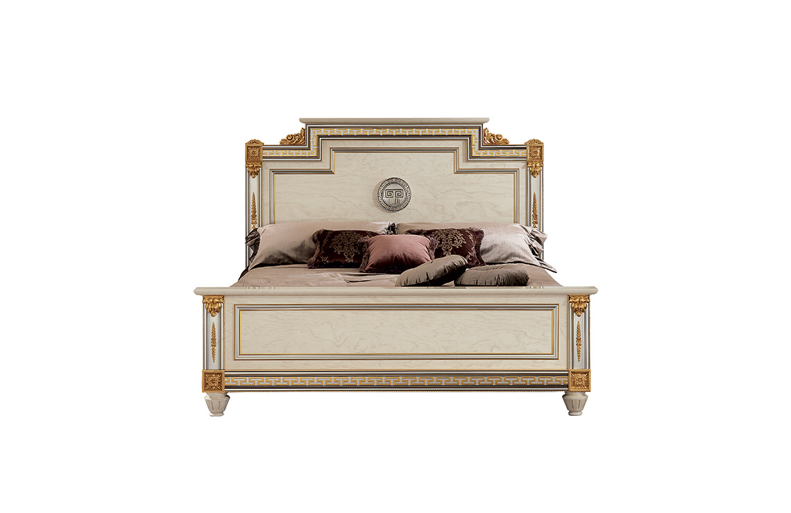 Nel letto Liberty, la prima cosa che cattura lo sguardo, è la sua potenza geometrica. Lungo la testata corre una greca dai toni argentati contrapposti a quelli dorati , leitmotiv di tutta la collezione. Le colonne laterali sono impreziosite da decori in foglia oro come vere e proprie sculture pregiate. Il letto è l’elemento in cui il gusto per la decorazione si coniuga felicemente all’armonia del design.