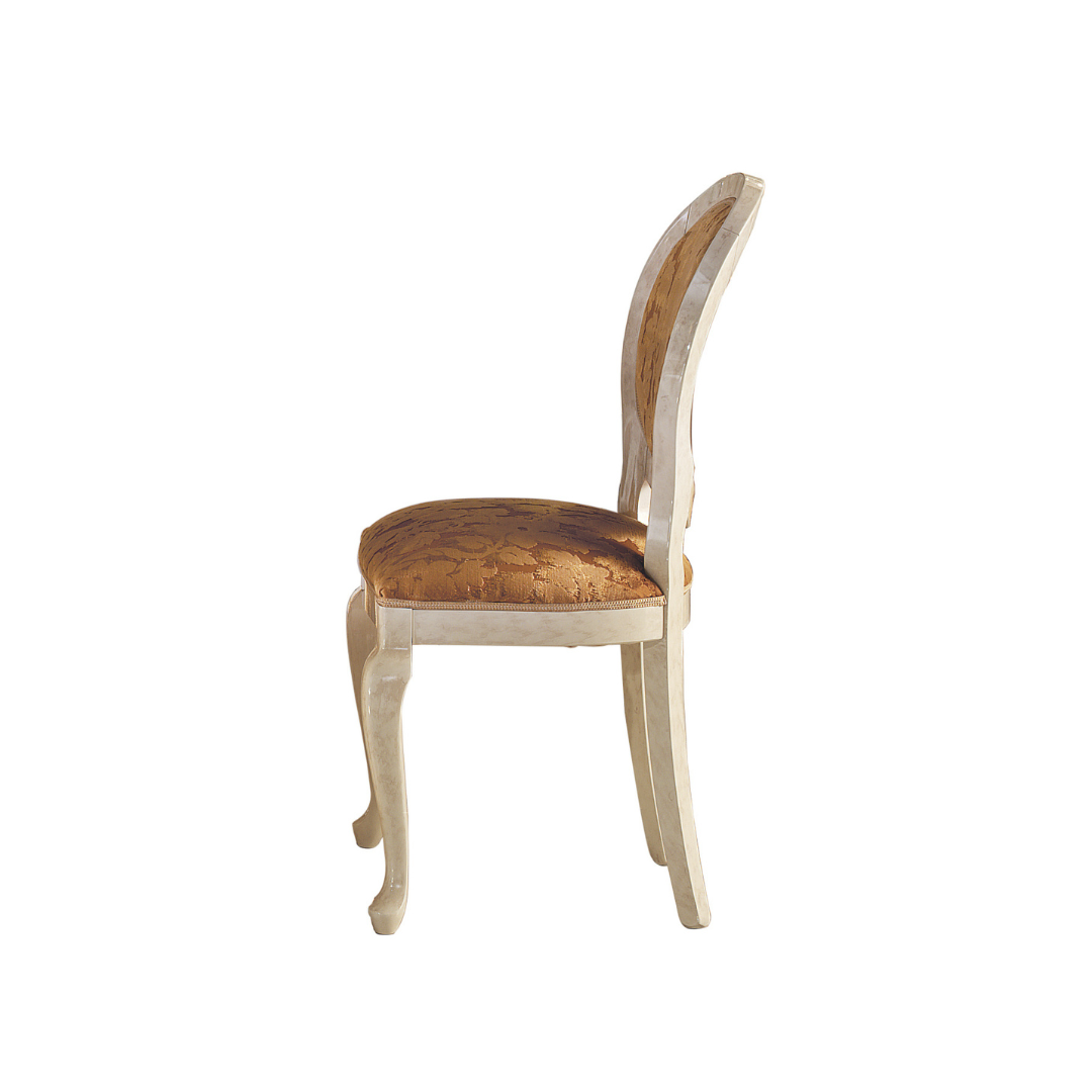 Non possono mancare delle sedie importanti a cornice dei complementi del soggiorno Melodia. Lo schienale ovale, impreziosito dal rivestimento in sete e broccati, rende queste sedie elementi dalla forte personalità, richiamandoci ad ambientazioni regali e piene del fascino senza tempo che caratterizza i modelli del design italiano.